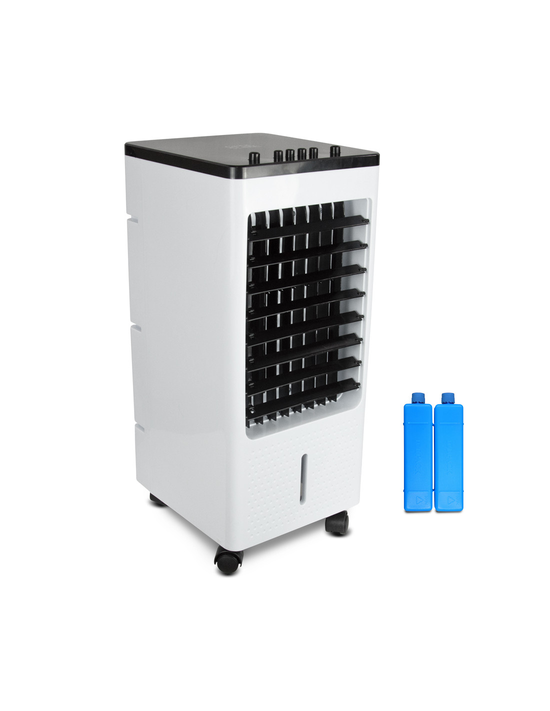 - Couleur: blanc et noir - Puissance: 75 W - Réservoir d'eau: 4 L - Oscillation horizontale automatique - 3 vitesses - Équipé de roues pour un déplacement aisé - Permet de rafraichir et d'humidifier l'air - Témoin de remplissage de la cuve - Dimensions: 280 x 235 x 535 mm - Livré avec 2 poches à glaçons - Poids net : 3.4kg - Garantie : 2 ans